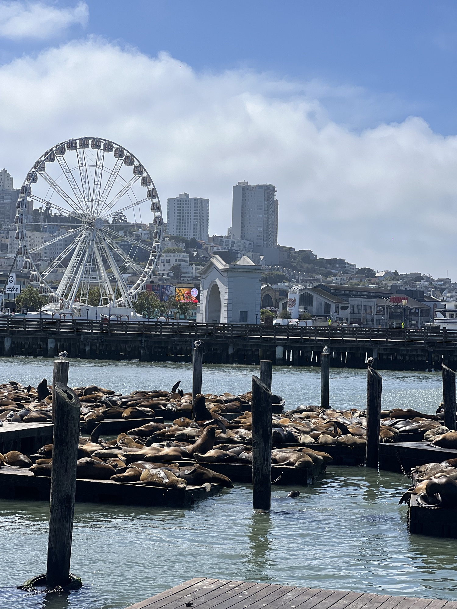 I love coming here because the vibes are always fantastic, and I like watching the sea lions sunbathe!